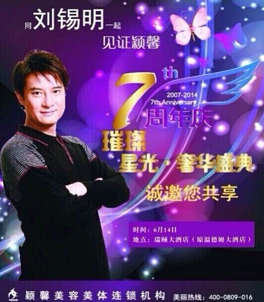 2014年6月14日,香港著名影视歌艺人刘锡明随星环明星经纪公司来到厦门,入住厦门瑞颐大酒店,应邀出席厦门颖馨美容美体机构“璀璨星光 奢华盛典”七周年庆典活动。颖馨通过刘锡明的影响力,当晚吸引了近千名顾客参加这场盛宴。